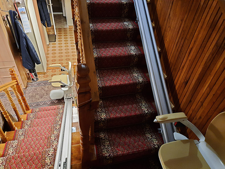 Az alábbi képeken látható, hogy a széklift hogyan helyezkedik el a lépcsőn, mekkora belógása van, mind az alsó, mind a felső végálláson.